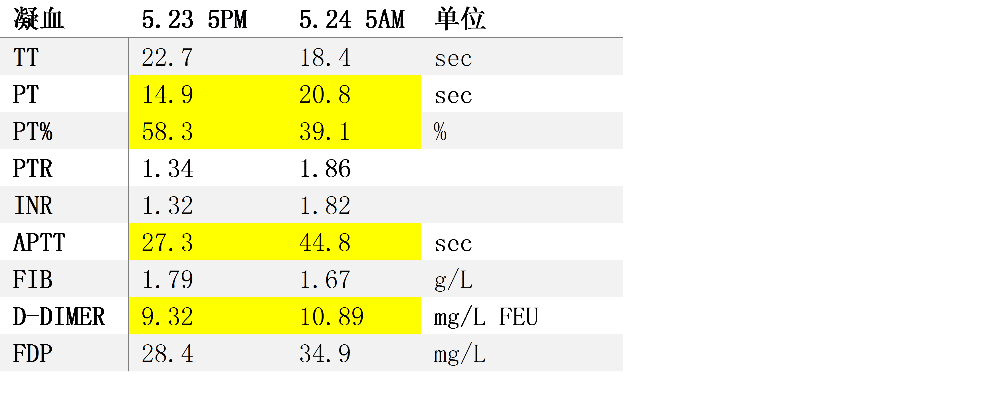 4、调取患者12h内全部化验,包括肝功、凝血及尿便常规,发现12小时内肝功及凝血均出现明显变化(表2,表3)