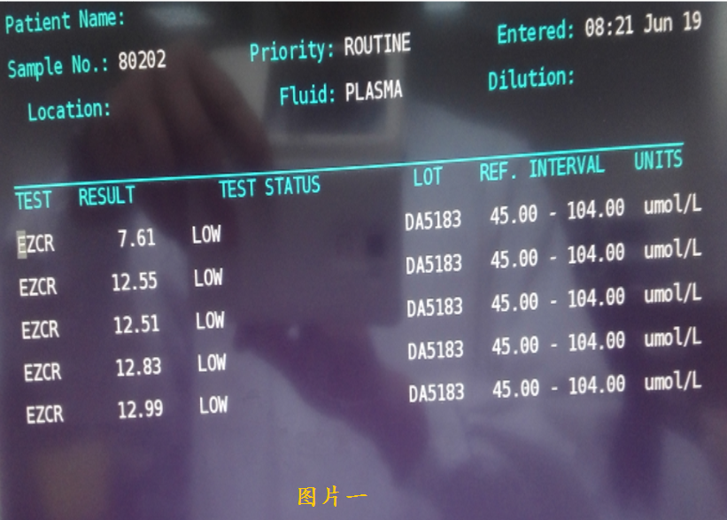 2015/06/18 在急诊生化分析仪查肌酐浓度为8.03umol/L(参考区间:男:59-104女:45-84),考虑与病人实际情况不符;在常规生化分析仪检测同一份样本肌酐浓度为60.7umol/L。