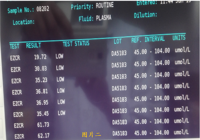 2、同一份样本再次于急诊生化分析仪复查后结果为:38.13 umol/L(首次结果为8.03umol/L),重复性差。