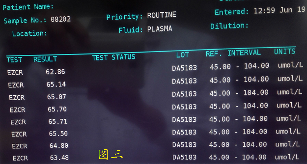 4、查看仪器试剂加样顺序,进一步分析怀疑同时检测肌酐和无机磷时,肌酐与无机磷同时检测时有干扰,取出无机磷试剂,复查同一样本,重复性良好,结果如图三,8次结果平均是为64.78umol/L,CV为1.63%。