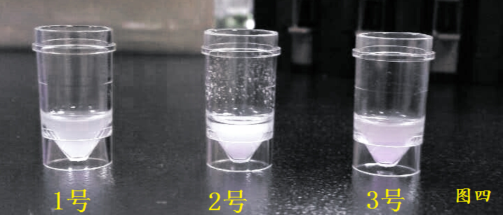 模拟实验检测过程,按着仪器参数设定的试剂及样本量,将酶法肌酐的三种试剂成分和的血清加入到三个管中,然后加入无机磷的三种试剂成分。发现结果如图四,相比2,3号,1号杯子红色明显浅于2,3号杯,如图四。