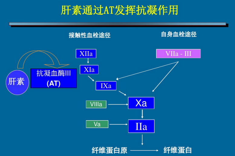 2、肝素抗凝机制:⑴抑制凝血酶原激酶的形成:①肝素与抗凝血酶Ⅲ(AT-Ⅲ)结合,形成肝素AT-Ⅲ复合物;②AT-Ⅲ是一种丝氨酸蛋白酶抑制剂,对具有丝氨酸蛋白酶活性的凝血因子,如因子Ⅻa、Ⅺa和Ⅹa等灭活;③肝素是与AT-Ⅲ的δ氨基赖氨酸残基结合成复合物,加速其对凝血因子的灭活作用,从而抑制凝血酶原激酶的形成,并能对抗已形成的凝血酶原激酶的作用。⑵干扰凝血酶的作用:小剂量肝素与AT-Ⅲ结合后即使AT-Ⅲ的反应部位(精氨酸残基)更易与凝血酶的活性中心(丝氨酸残基)结合成稳定的凝血酶-抗凝血酶复合物,从而灭活凝血酶,抑制纤维蛋白原转变为纤维蛋白。⑶干扰凝血酶对因子ⅩⅢ的激活,影响非溶性纤维蛋白的形成;阻止凝血酶对因子Ⅷ和Ⅴ的正常激活。⑷防止血小板的聚集和破坏:肝素能阻止血小板的粘附和聚集,从而防止血小板崩解而释放血小板第3因子及5-羟色胺。肝素的抗凝作用与其分子中具有强阴电荷的硫酸根有关。当硫酸基团被水解或被带有强阳电荷的鱼精蛋白中和后,迅即失去抗凝活力。