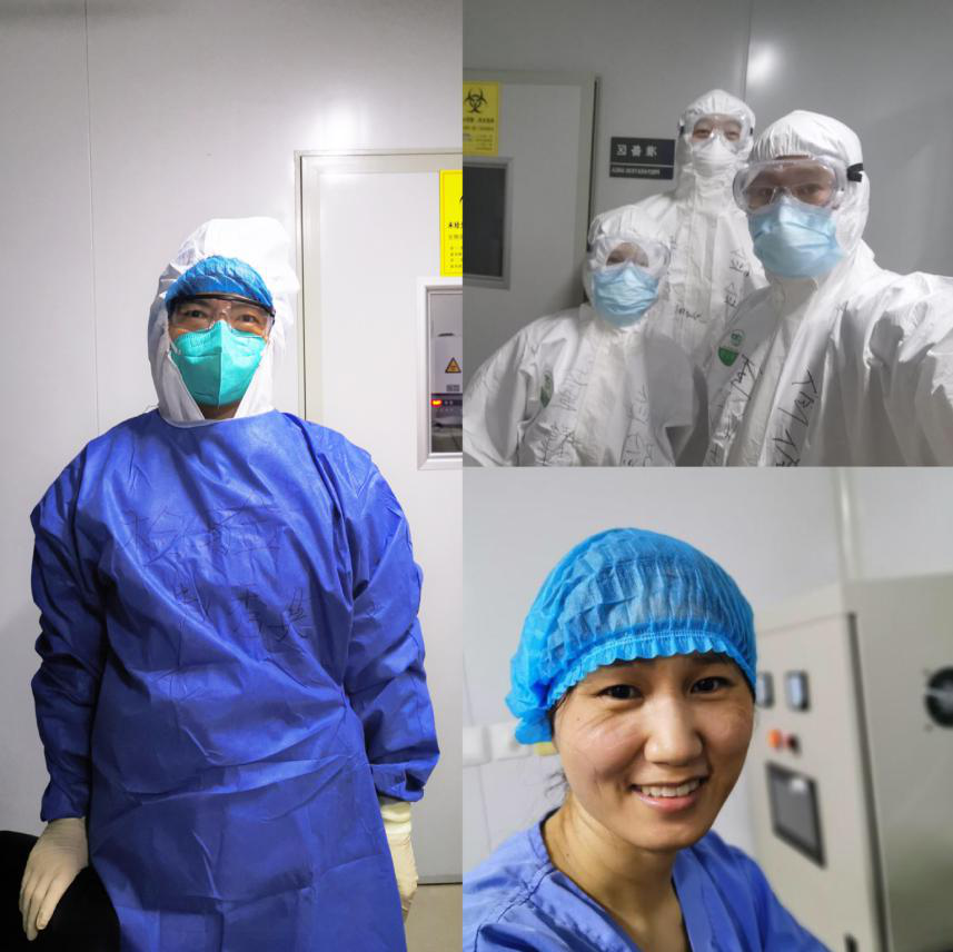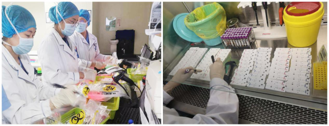业务开展首日,200余份咽拭子样本分批送到检验医学科,从收件到样本处理、再到核酸提取,李润青、朱东、董静肖三位技术人员从早9点进入实验室,将近下午3点才出来吃上“午饭”,当晚9点前发完最后一份报告,汗水早就浸湿防护服,顺着头发滴落。赵秀英作为曾参与过SARS病毒与H1N1流感病毒检测的“老兵”,这次同样披挂上密不透风的防护服冲锋在前,在实验室一待就是半天。医院恢复正常医疗服务后,业务量迅速增加,常规检查检验工作同样不能放下。骨髓读片岗骨干技师高远需要先发完骨髓报告,再进入实验室做核酸检测,晚上8点后下班是常事;微生物组人员紧张,肖楠、刘琳先做一部分检验再进到PCR实验室;收件岗的宋力、贾艳琴更是认真对待每份样本,加班从不抱怨。未参加核酸检验的同事,此时主动站出来,承担起大量常规工作,全力保障新冠核酸检测高效进行。