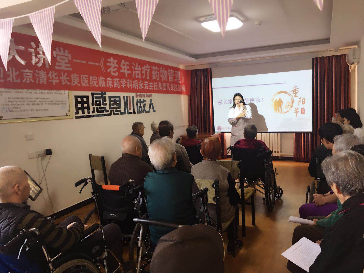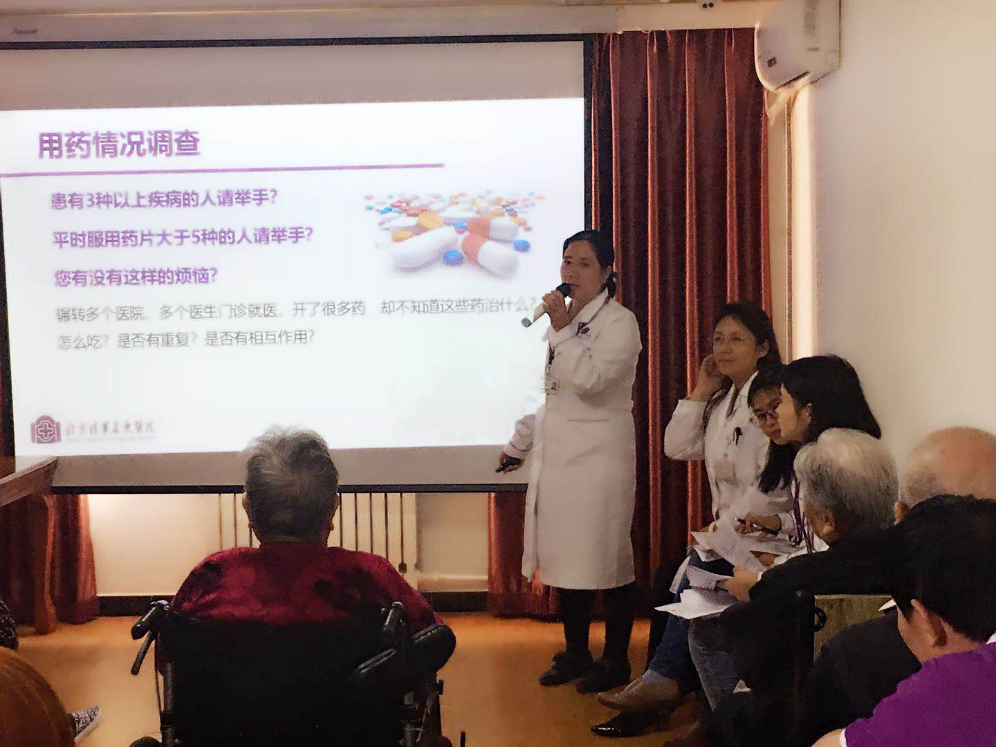北京清华长庚医院10月16日电(临床药学科 孟剑湃 张微微)在今年的重阳节来临之际,我院临床药学科胡永芳主任及由张微微、孟慧杰、颜妍、孟剑湃组成的临床药师团队联合我院社会服务组于10月16日赴天通大爱颐养中心进行了科普讲座及现场治疗药物管理活动,把合理用药理念和用药管理服务带到老年人身边。