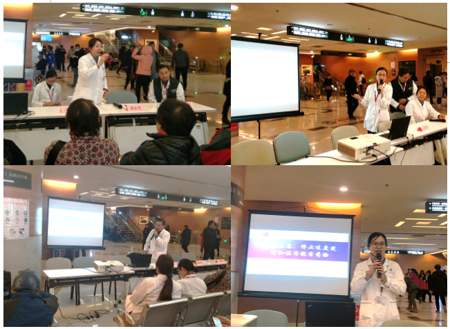 活动一开始,临床药学科胡永芳主任首先对提高抗菌药物认识周进行了介绍,并提出 “感冒就要吃抗菌药物吗?家人吃的抗菌药物你也能吃吗?”等问题引发了患者的思考。随后,感染性疾病科林明贵主任做了题为“抗生素的合理应用及病例分享”的报告,用一个个活生生的病例告诉大家误用抗菌药物的危害。又通过药物引起剥脱性皮炎及药物性耳聋的例子告诉大家合理应用抗菌药物的重要意义。在场的观众都倍感震撼,感叹林主任的报告让他们提高了这方面的认识。第二个报告是由普内科马序竹医师带来的“聊聊抗生素的那些事儿”,从抗菌药物的分类讲到了细菌耐药机制,深入浅出的提醒患者,如果我们再不采取行动,以后就真的只能对“超级细菌”束手无策了。另外,她根据自己在临床上碰到的形形色色抗菌药物的用药误区,为现场的患者朋友做了非常深入的科普。包括“(1)只要一发烧,就得吃头孢;(2)嗓子都疼了,不吃抗菌药物不行了;(3)必须要输液,口服不管用;(4)吃了一天不退烧,这个药不行马上换;(5)一有效,就停药;(6)之前吃的药挺管用,以后就用它。”患者都反映,这样接地气的科普真是让人受益匪浅,现场不时传来阵阵掌声。其实,无论是医务人员还是广大患者,都应该了解这些知识。最后一位讲者是临床药学科的年轻药师颜妍,她首先向大家介绍了什么是抗菌药物,又通过“好”细菌“坏”细菌的事儿向大家科普了抗菌药物应用后对机体的影响。此外,她还科普了抗菌药物不等于消炎药,90%的感冒都是由病毒引起的等内容。三位讲者生动的讲座让现场气氛十分热烈。大家纷纷驻足,等待接下来的义诊环节,让专家为自己解惑。今天的义诊活动,各位老师累计为30多位患者答疑解惑,用实际行动践行本次活动的主旨。