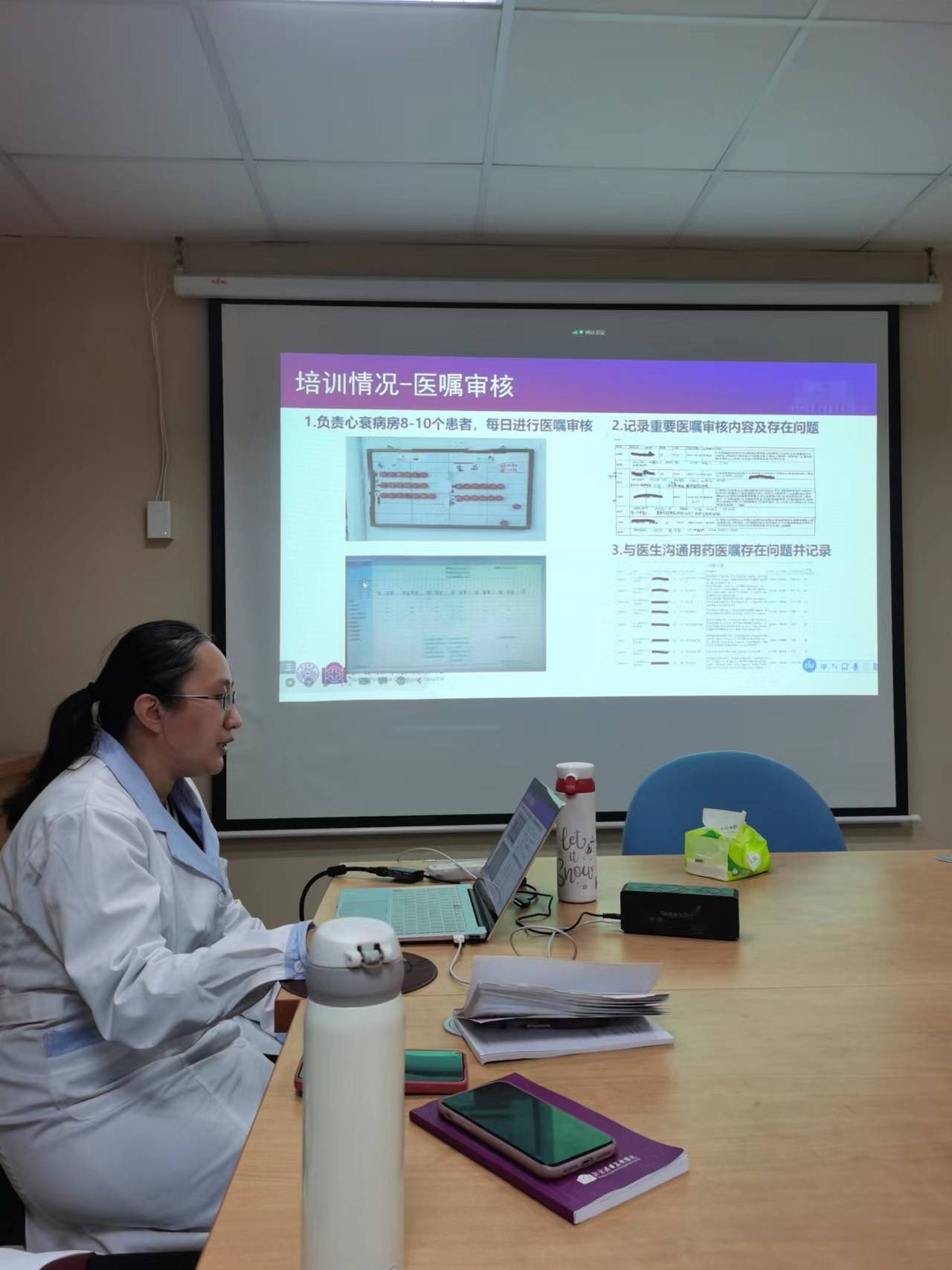 首先是2021-2022年度赴外院进行专科临床药师规范化培训的药师孙坤、颜妍对一年的培训收获加以汇报。孙坤、颜妍两位药师介绍了所在进修的安贞医院、北京大学第三医院药学部门组织架构、工作模式,及临床药师组织架构、人员构成、工作内容、工作成果等,着重介绍了同侪医院临床药学工作特点,并与临床药师分享了这一年培训内容、学习心得。最后二位药师也对自己未来工作方向做出了规划。