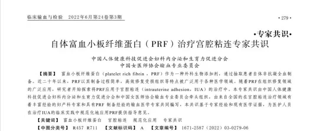 目前《自体富血小板纤维蛋白(PRF)治疗宫腔粘连专家共识》已在临床输血与检验杂志202 2年6月第24卷第3期发表。