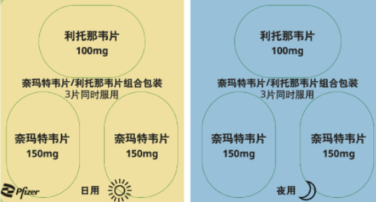 本品每12小时一次口服给药,连续服用5天。推荐剂量为每次奈玛特韦300mg(150mg×2片,粉色)联用利托那韦100mg(100mg×1片,白色)。本品可与食物同服,也可不与食物同服。片剂需整片吞服,不得咀嚼、掰开或压碎。