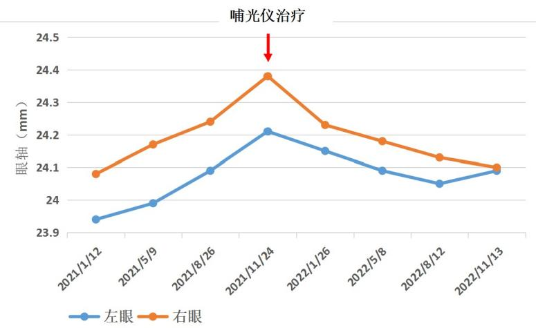 面对快速增长的眼轴和近视,患儿与家长都陷入了焦虑之中。在与家长充分的沟通后,刘瑄为聪聪安排了连续低强度红光照射治疗(哺光仪),1个月后复查显示眼轴缩短为右眼24.23mm,左眼24.15mm;近11个月后,右眼缩短了0.28mm,左眼0.12mm,双眼近视的度数也同步降低了,右眼降低了50度,左眼降低了约25度,聪聪快速发展的近视被按下了暂停键。