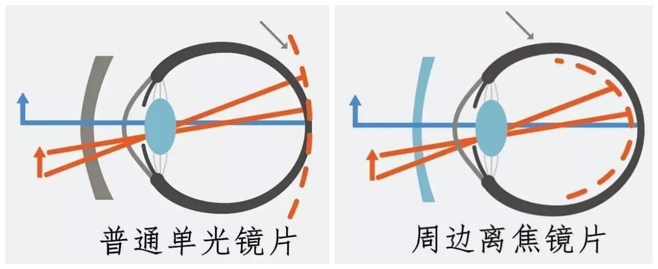 近几年,随着特殊设计的功能型近视控制镜片的产品研发,离焦镜片脱颖而出。离焦矫正眼镜,外观与普通框架眼镜一致,但其镜片上有特殊的离焦设计:普通单光眼镜,仅仅起到矫正视力的作用,让人能够看清楚,而周边离焦矫正眼镜,作用原理是光线通过镜片在视网膜上成清晰像,让另一部分光线聚焦在视网膜前,形成近视性离焦信号,从而起到抑制近视加深的作用,既能矫正视力,又能控制近视度数的增长。