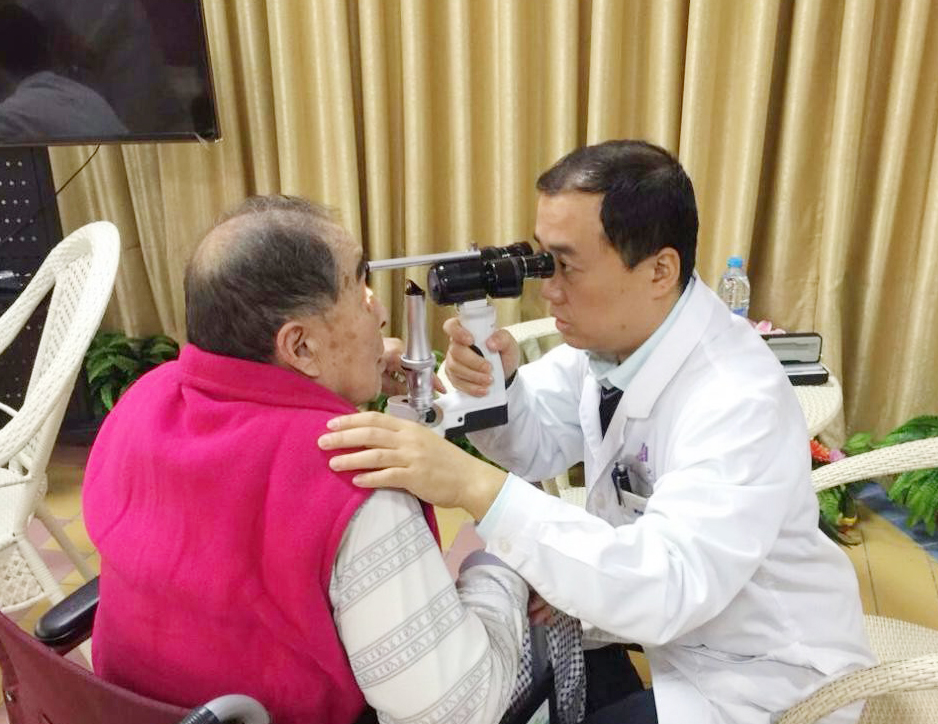 北京清华长庚医院眼科副主任医师郭立斌为敬老院里的老人进行眼部检查