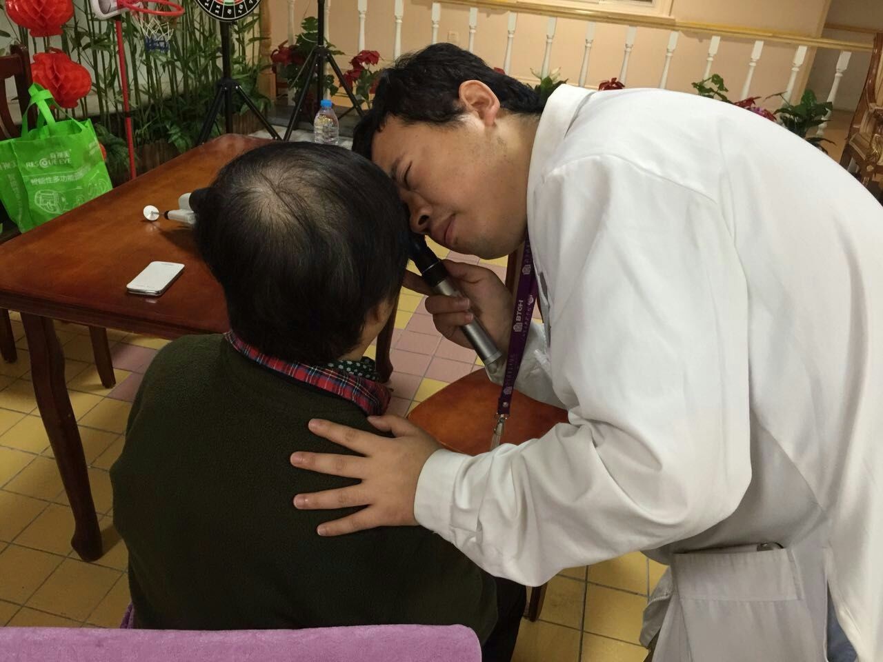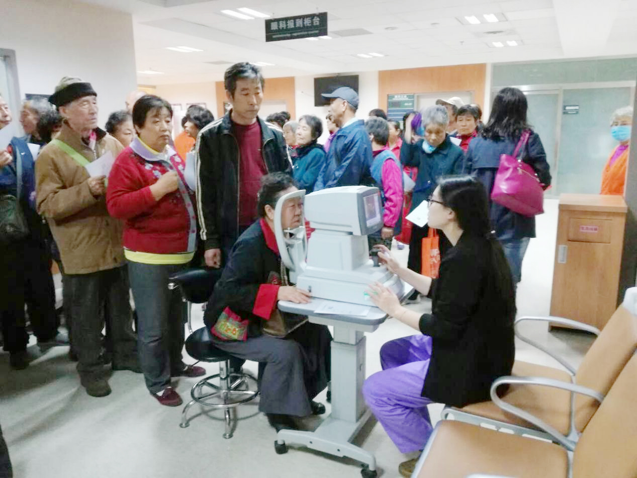 2016年10月15日上午,在眼科郭立斌副主任医师的带领下,眼科医护人员来到立水桥颐养中心,为这里的老人进行眼科健康检查。眼科医师为老人们进行眼部检查,询问老人们眼睛的健康状况,耐心解答老人们关心的眼科问题。颐养中心的负责人说,“这里的老人大多行动不便,平时去医院也比较麻烦。北京清华长庚医院成立,走进基层社区,方便了苑里的居民看病,也直接服务了院里的老人,有大医院替我们保驾护航,我们的健康有保障了。”