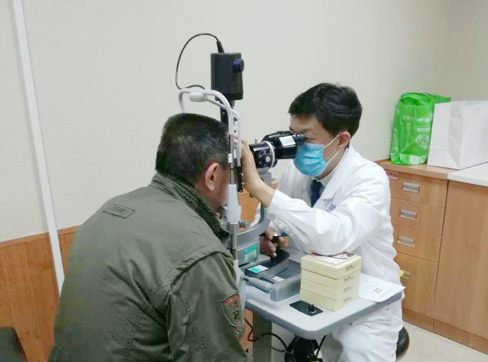北京清华长庚医院眼科副主任医师乔荣华为义诊民众进行眼部检查
