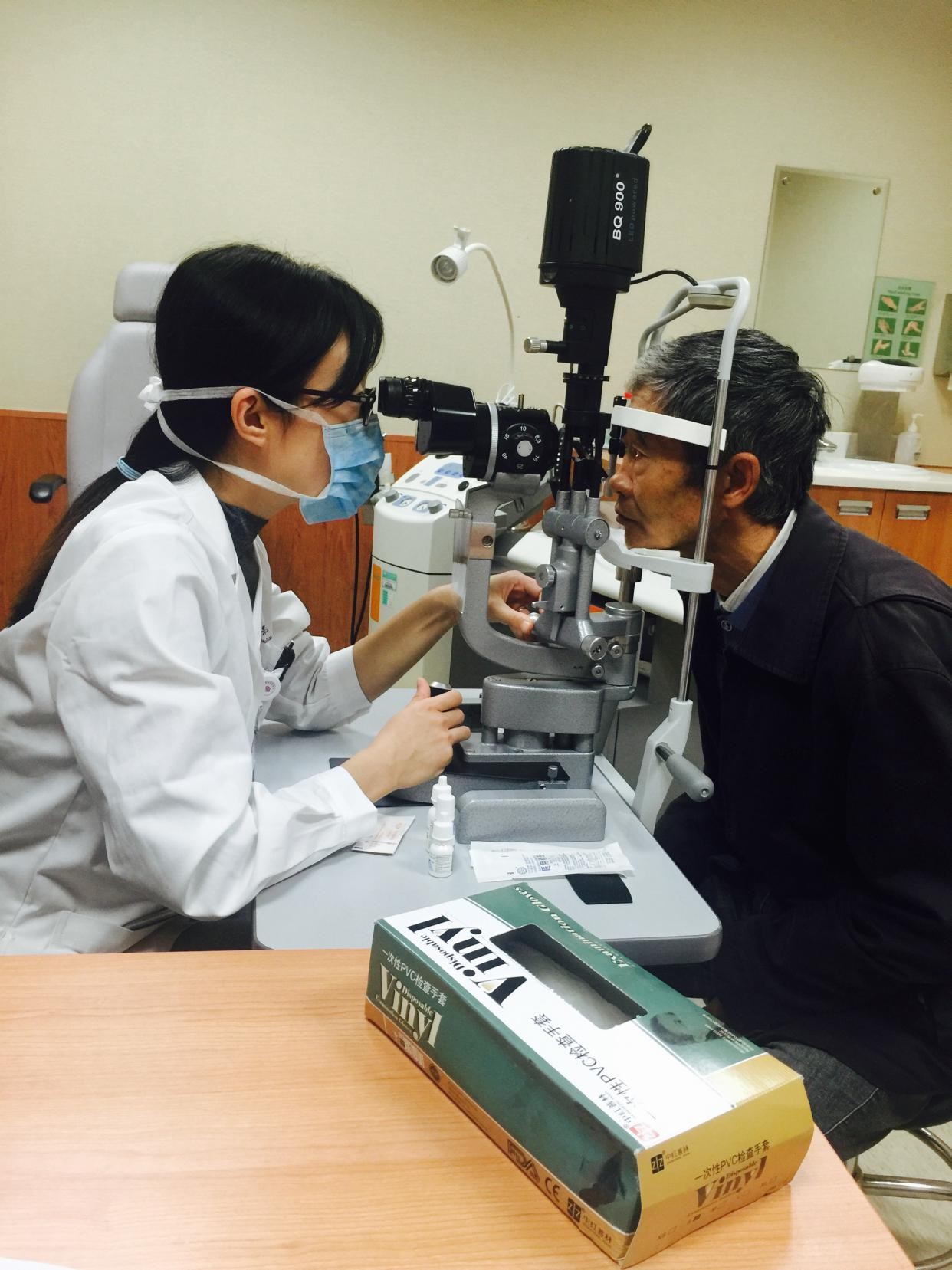 北京清华长庚医院眼科主治医师王韧琰为义诊民众进行眼部检查