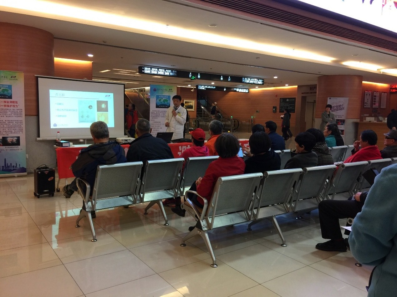 当天下午,一楼的门诊挂号大厅早早的坐满了前来聆听的群众。首先由眼科乔荣华副主任医师向在场听众讲解青光眼的相关知识。“若出现眼痛、视力迅速下降等症状,一定要警惕了。”乔主任向大家强调,青光眼的急性发作是眼科的急症,需要尽快处理,否则会对视功能产生不可逆性的损伤。乔主任还说,青光眼并没有那么可怕,定期体检、早期发现、及时治疗是防治青光眼的关键。随后,眼科刘瑄副主任医师对青光眼的相关检查进行了形象生动的讲解。刘主任说,青光眼的相关检查非常的繁杂,患者常常难以理解为什么青光眼要做这么多的检查,以及每个检查的意义所在。“眼压是诊断青光眼最基础的检查,重要性好比心内科的血压。要像监测血压一样来监测眼压,从而保护我们的视力。”刘主任着重强调了眼压在青光眼诊治中的重要性。