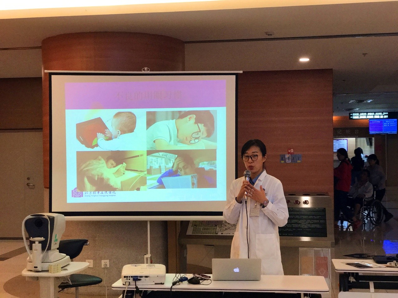 今天下午,长庚眼科在医院一号楼挂号大厅举办大型科普讲座及义诊活动。首先由眼科王韧琰医师进行的科普讲座,她主要的工作方向是眼视光及小儿斜弱视专业。