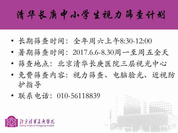 为响应号召,我科视光中心启动中小学视力筛查工作,免费为中小学生查视力及显然验光,并对其近视防护作出指导。全年每周六上午作为长期筛查时间,6月6日至8月30日每周一到周五全天作为暑期筛查时间。希望广大爱眼人士积极参与。