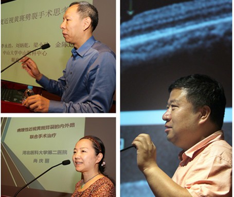 高度近视引起的黄斑劈裂是一个眼科难题,治疗方式尚未有明确定论。此次论坛,分别有三位教授对这个问题进行了探讨。来自中山大学眼科中心的吕林教授开展“兜带术”治疗黄斑劈裂,通过五年的经验积累,目前已取得显著成效。此次报告他介绍之所以选择“兜带术”经验历程,分享了该术式对高度近视黄斑劈裂的治疗效果。河北医科大学第二医院尚庆丽教授则选择“巩膜缩短+内界膜撕除”,这种方法向外消除了后巩膜葡萄肿的牵引,向内消除了内界膜及玻璃体的牵拉力,使得黄斑结构得以恢复,同样取得了良好的效果。上海交通大学新华医院赵培泉教授认为,内界膜撕除足以使得黄斑劈裂复位,但是保留黄斑内界膜,保持黄斑视网膜结构完整性更重要。现场眼科同仁讨论热烈,各抒己见,大家感到受益匪浅。
