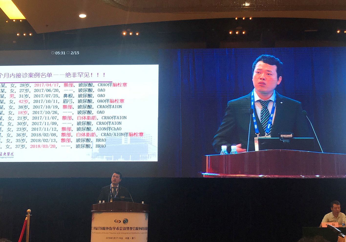 司山成主治医师就面部微整形引起的严重眼部血管阻塞性疾病的临床特征进行了深入分析,通过典型病例的展示向所有参会的眼科同道展示了这种由于不规范面部微整形操作导致的严重眼部并发症绝非罕见(图3)。最后,司山成医师以一首打油诗结束自己的学术报告,赢得在座参会医师的热烈掌声和阵阵好评,将会议推向了高潮(图4)。