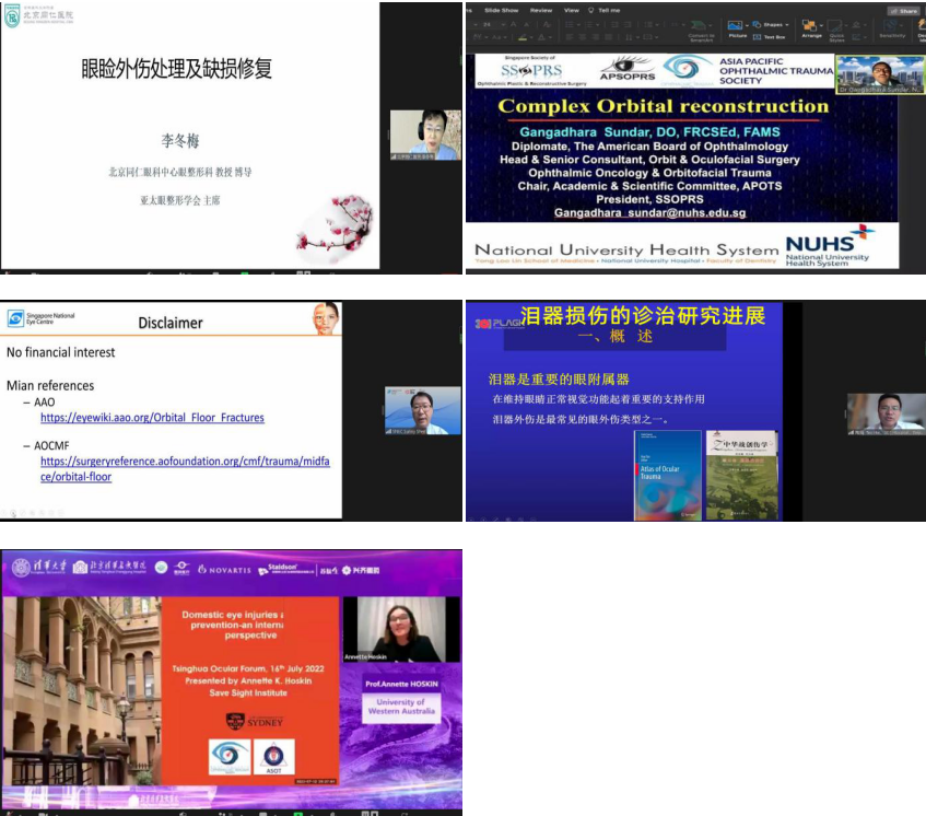 来自新加坡国立大学医院Gangahara Sundar教授、新加坡国立眼科中心Sunny Shen教授、北京同仁医院李冬梅教授和悉尼大学Annette Hoskin教授分别对复杂性眼眶眼睑外伤的手术修复重建分享了宝贵的临床经验,并与在线学员及同道进行了热烈的讨论。