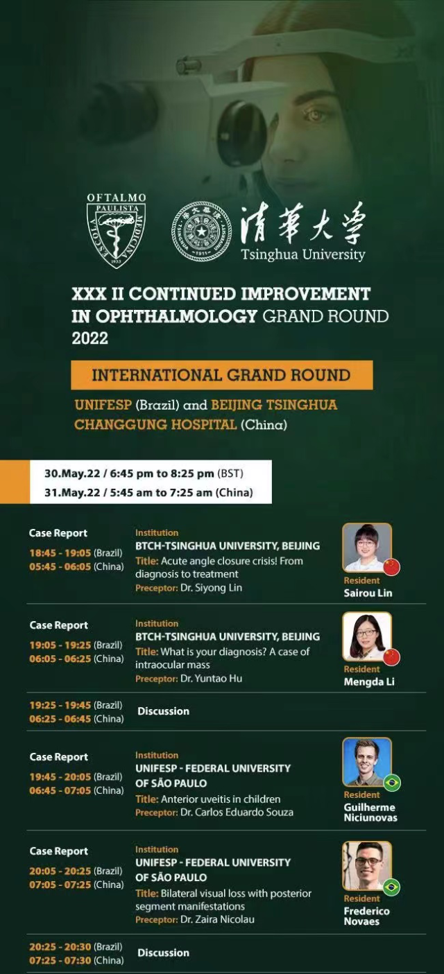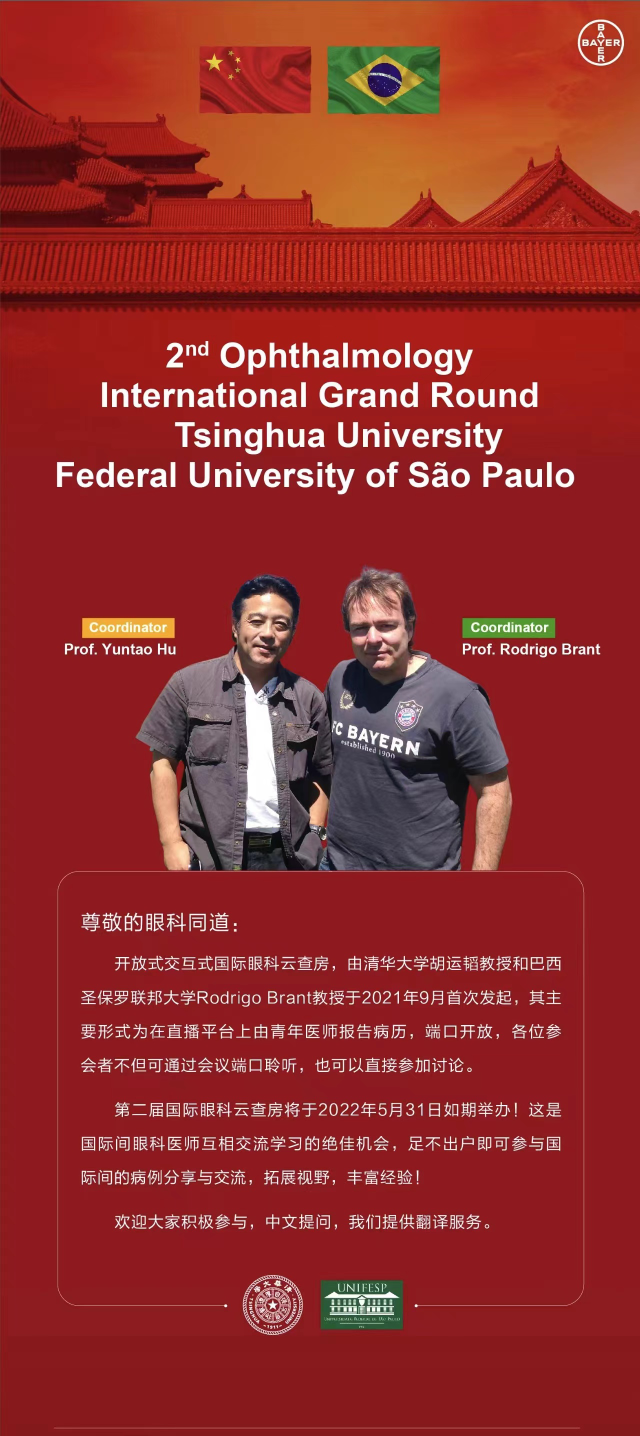 该活动由北京清华长庚医院眼科主任胡运韬教授与巴西圣保罗大学眼科学系教授、de Olhos眼科医院视网膜青光眼科主任Rodrigo Brant教授共同发起,通过中、巴两所医院联合云查房及疑难病例讨论的形式,增强眼科国际化学术合作与交流,开阔眼科医师国际化视野,为两国眼科医师搭建高水平、多层次的交流平台。使眼科医师从中获得新的理念、新的启发、新的知识和技术手段。更好的为广大眼病患者提供高质量医疗服务。