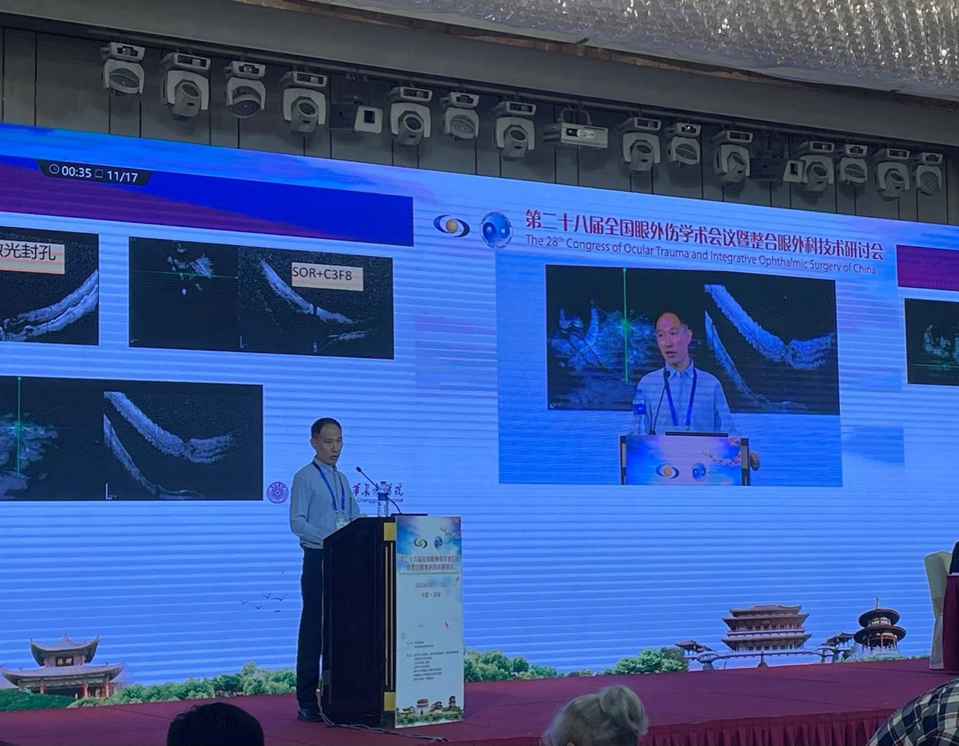 胡运韬教授参与主持大会开幕并进行了“开放眼外伤救治的清创理念”的专题发言; 在疑难病例与手术视频交流单元、英文专场等多项会议环节进行指导;林思勇教授就“病理性近视血管旁裂孔致视网膜脱离的手术处理”进行大会发言;王奇骅医师和杜宇医师分别进行了英文发言,受到与会专家的关注与好评。