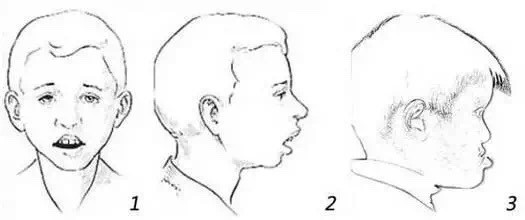 图一:腺样体的两种面型:1、2脸型呈小下颌,3脸型呈地包天