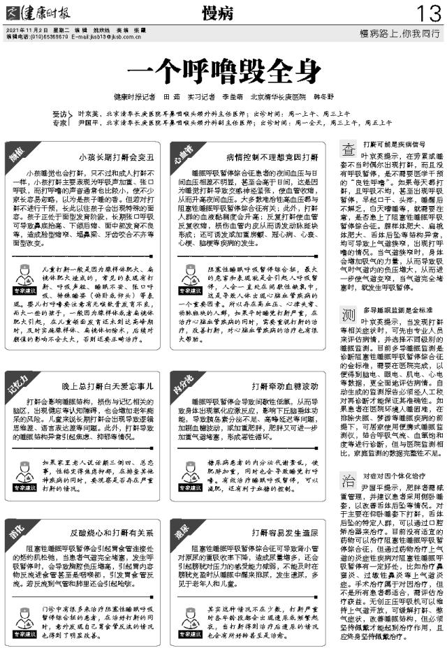 叶京英提示,在劳累或睡姿不当时偶尔出现打鼾,而且没有呼吸暂停,是不需要医学干预的‘良性呼噜’。如果每天都打鼾,且呼吸不均,甚至出现呼吸暂停,早起口干、头疼,睡醒后不解乏,白天嗜睡等,就需要注意,是否患上了阻塞性睡眠呼吸暂停综合征。腺样体肥大、扁桃体肥大、舌体后坠等结构异常,均可导致上气道狭窄,出现打呼噜的情况。当气道狭窄时,身体会增加吸气的力量,从而导致吸气时气道内的负压增大,从而进一步使气道变窄,当气道完全堵塞时,就发生呼吸暂停。