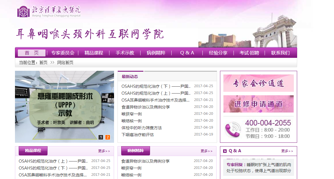 2017年5月,由我院耳鼻咽喉头颈外科建设的“北京清华长庚医院耳鼻咽喉头颈外科互联网学院(qhent.yiboshi.com)”于2017年5月6日正式上线!