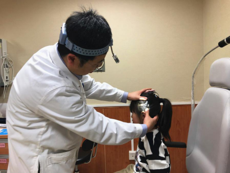 图为伊海金主任医师为小丽丽复查人工耳蜗