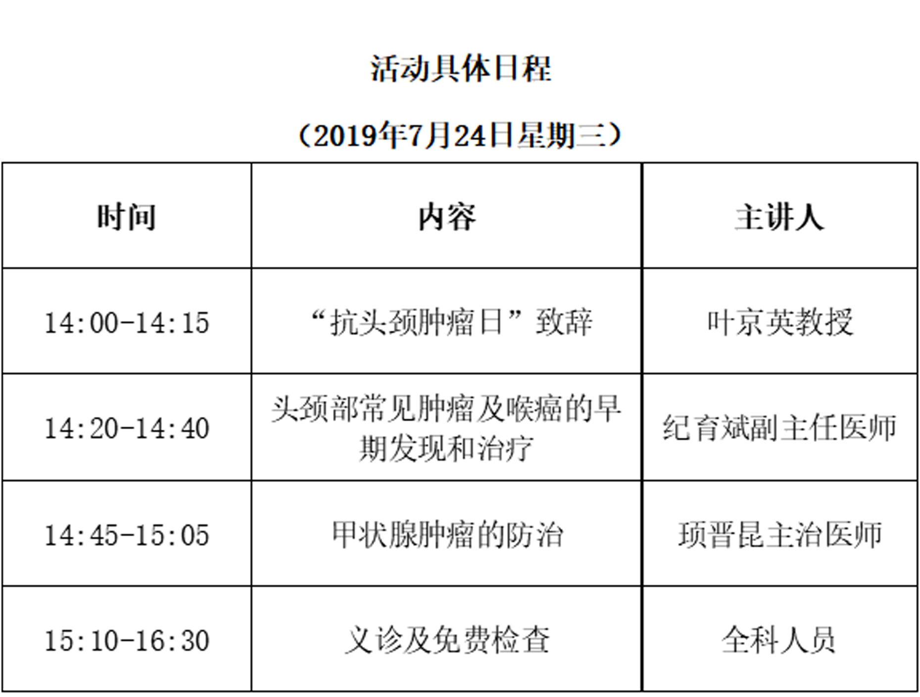 为了进一步在群众中做好头颈肿瘤的防治宣传工作,做好头颈肿瘤的早期诊断和早期治疗工作,更好的服务于广大患者,北京清华长庚医院耳鼻咽喉头颈外科拟定于7月24日下午14:00点在北京清华长庚医院门诊大厅开展“世界抗头颈肿瘤日”免费讲座和义诊活动。活动中将讲授喉癌、甲状腺癌等常见头颈肿瘤疾病的防治知识,并开展免费查体、咨询和义诊活动。
