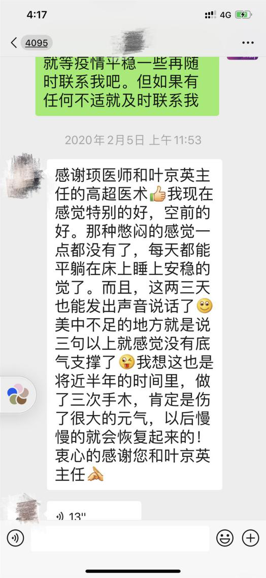 新冠疫情防控期间,顼晋昆也一直通过微信等方式保持对患者的随访,随着疫情的逐渐平稳,患者来院复查后,叶京英医师根据患者检查情况,为其进行了另一侧的杓状软骨切除术。术后患者呼吸明显改善,说话声音清晰,可以进行良好的沟通。患者常常录制小视频记录日常点滴,通过练习,她打算再次站在喜欢的讲台上,去圆自己“优秀讲师”梦想!