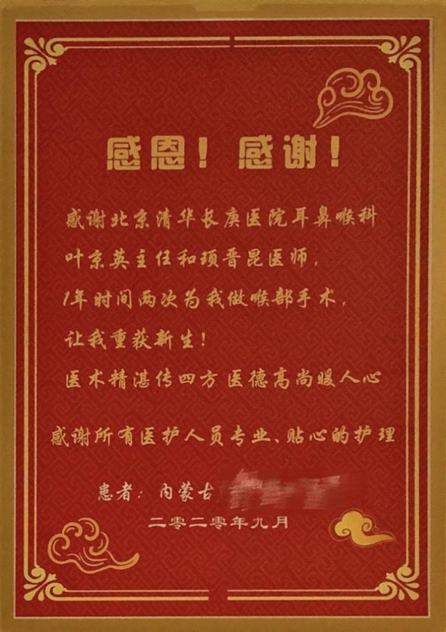 北京清华长庚医院11月17日电 (耳鼻咽喉头颈外科 顼晋昆)11月的一个上午,我院耳鼻咽喉头颈外科主任叶京英诊室外早早来了一位打扮精致的阿姨。她一直盯着进出诊室的患者,但却始终没有上前打扰,直到出现等候患者的空隙,她激动地走入诊间眼含热泪地频频鞠躬,随后将怀里已经暖热的感谢牌送到了叶京英手中。