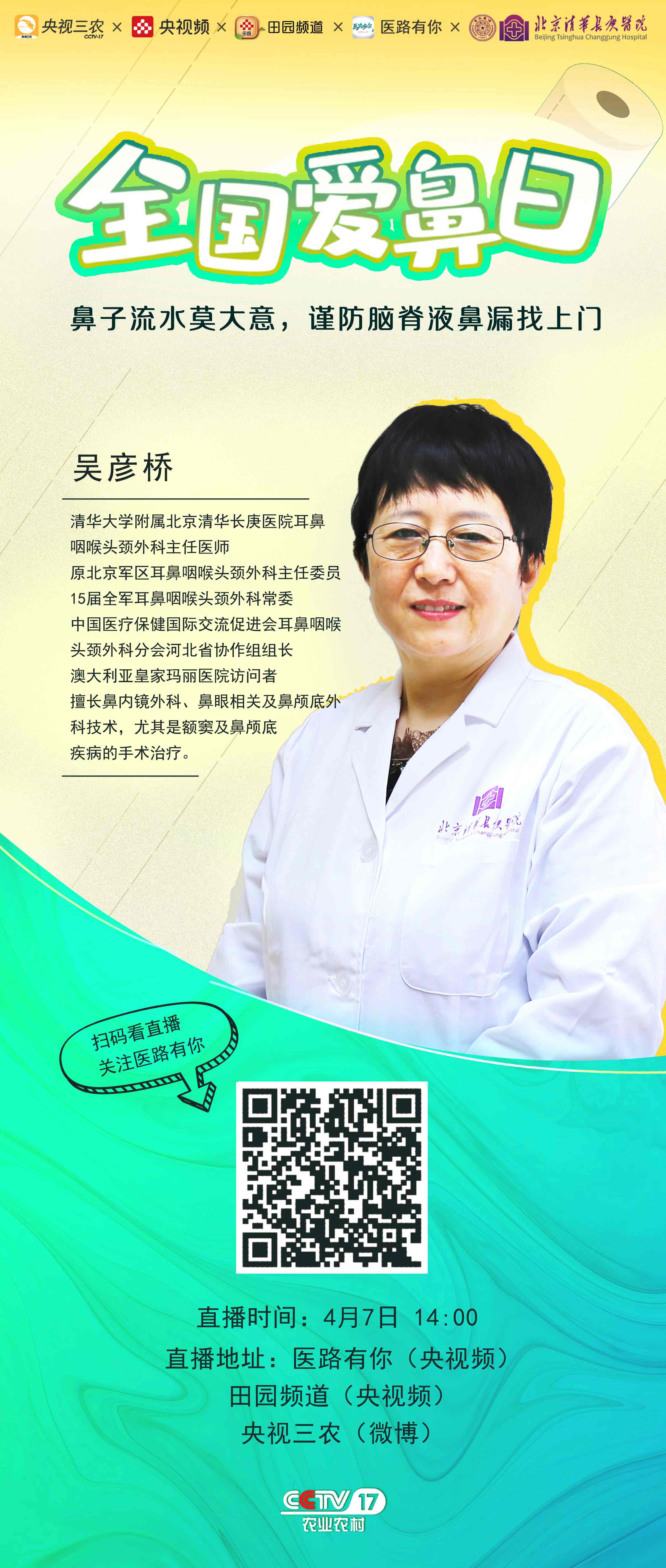 4月10日是全国爱鼻日,清华大学附属北京清华长庚医院耳鼻咽喉头颈外科主任医师吴彦桥,将于4月7日14:00做客央视频直播,和您一起关注鼻腔健康。欢迎大家到时收看!