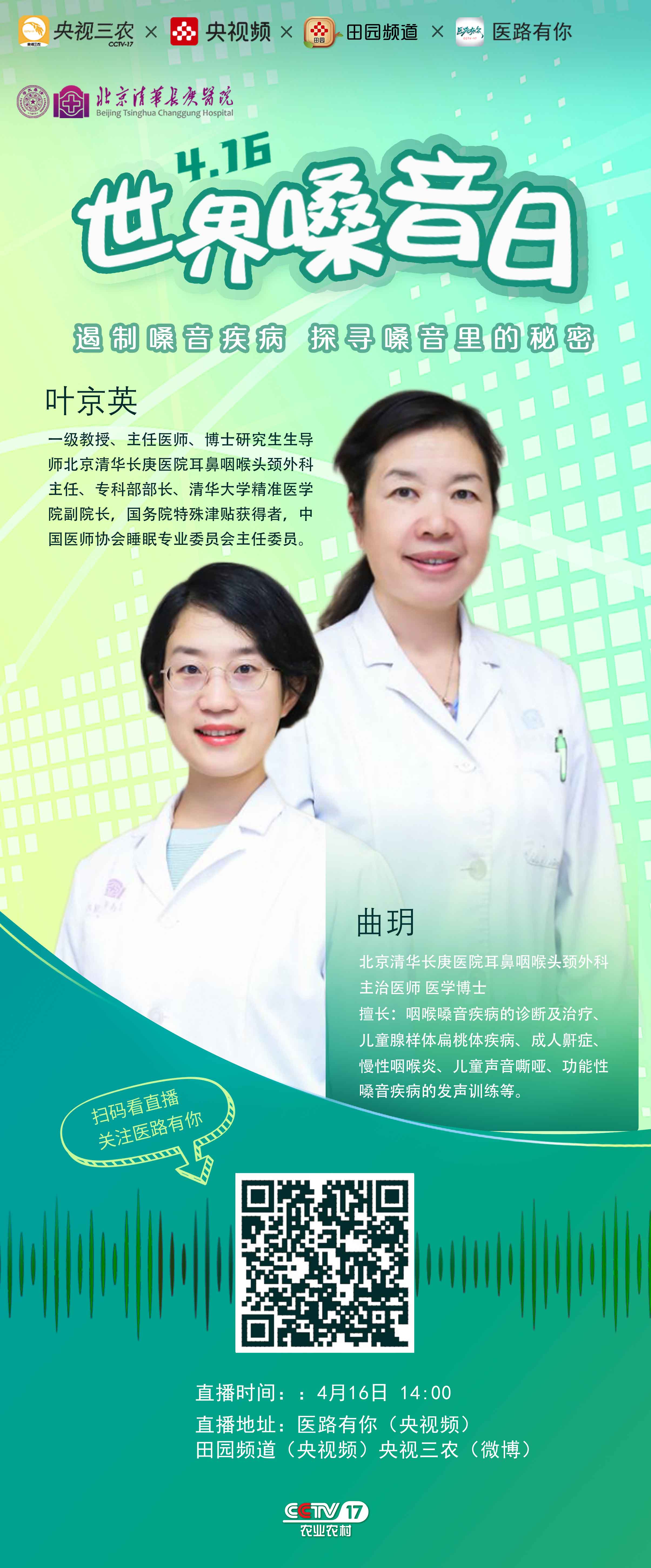4月16日是世界嗓音日,常见的嗓音疾病有哪些?该如何防治?哪些方法可以帮我们练就一副“金嗓子”?4月16日14:00,清华大学附属北京清华长庚医院耳鼻咽喉头颈外科主任、主任医师叶京英、主治医师曲玥将做客央视频直播间,和大家一起科学养“声”,欢迎大家届时观看。