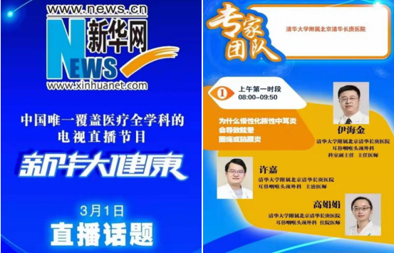 耳科组三位医生亮相中国唯一覆盖医疗全学科的电视直播——《新华大健康》,科室副主任、主任医师伊海金教授,领衔讲解《为什么中耳炎会导致眩晕、面瘫或脑膜炎》,主治医师许嘉博士和医师高娟娟博士,用自己的临床实践分析了中耳炎致眩晕面瘫的经验。