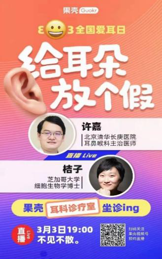 在3月3日爱耳日当天同一时间段,主治医师许嘉博士也在果壳直播间进行了科普、健康咨询工作,主治医师陈雯婧博士也直播了爱耳视频及健康咨询。在爱耳活动周中,北京清华长庚医院耳科专业组积极科普,用实际行动,为社会大众带来一场关于耳朵健康的“科普盛宴”。