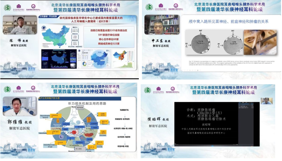由解放军总医院耳鼻咽喉头颈外科陈伟教授,解放军总医院耳鼻咽喉头颈外科医学申卫东教授,解放军总医院耳鼻咽喉头颈外科医学部研究所郭维维教授、解放军总医院耳鼻咽喉头颈外科侯昭晖教授分别就人工耳蜗微创植入关键技术及创新探索,内听道及周围结构的显微解剖及在保听-保面听神经瘤手术中的应用,炎症因子在噪声性耳聋的作用及干预策略,侧颅底外科常用手术入路等热点难点的前沿问题,进行深入浅出的讲解分析与讨论,共同呈现了精准诊疗网络,为实际临床工作、基础及临床科学研究提供指导和参考。