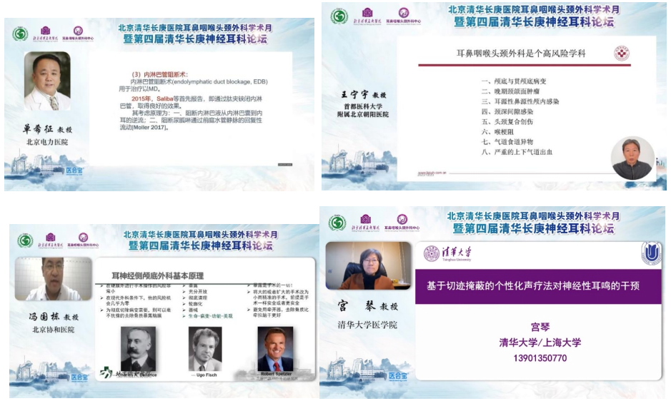 此后,由北京电力医院眩晕科学研究院院长单希征教授,首都医科大学附属北京朝阳医院耳鼻咽喉头颈外科王宁宇教授,北京协和医院耳鼻咽喉科冯国栋教授,清华大学声学和认知工程实验室主任宫琴教授,北京清华长庚医院耳鼻咽喉头颈外科伊海金教授分别就周围性眩晕外科治疗、患者利益与风险管控—岩尖胆脂瘤切除与同期CI植入,支撑耳内镜技术体系,基于切迹掩蔽的个性化声疗法对神经性耳鸣的干预,保留面神经功能的面神经肿瘤手术治疗进行讲析与分享,并结合具体案例,深入浅出,精彩纷呈。
