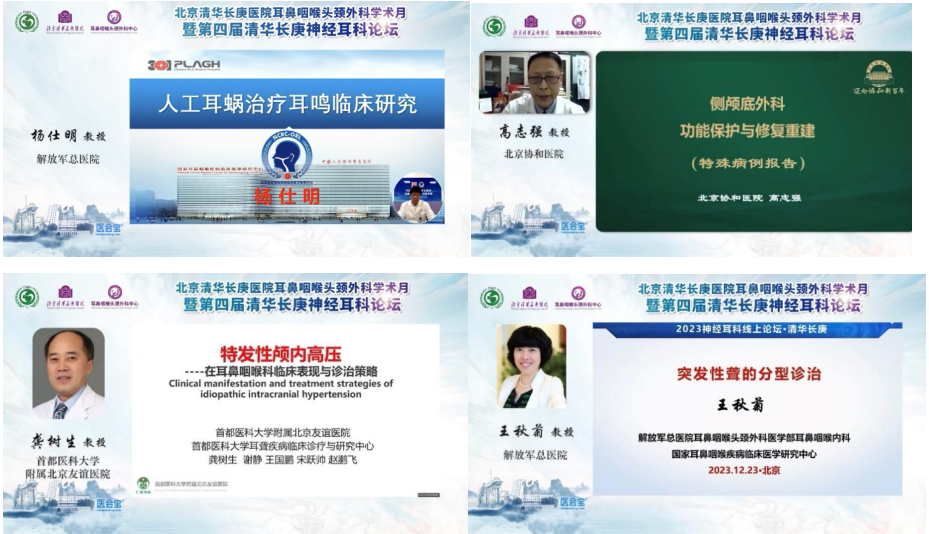 论坛有幸邀请到中国人民解放军总医院耳鼻咽喉头颈外科杨仕明教授,北京协和医院耳鼻咽喉头颈外科高志强教授,首都医科大学附属北京友谊医院龚树生教授,中国人民解放军总医院王秋菊教授分别就人工耳蜗治疗耳鸣,侧颅底外科的功能保护与重建,特发性颅高压以及不同类型突聋诊治临床实践进行前沿介绍与经验分享。