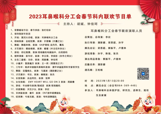 爆竹声声辞旧岁,烟花朵朵迎新春。虎年辞岁寒风去,兔年将至春风来!岁序更替,万物待新生。清华长庚耳鼻咽喉头颈外科分工会在疫情后秩序重建的忙碌中,迎来了2023年春晚。