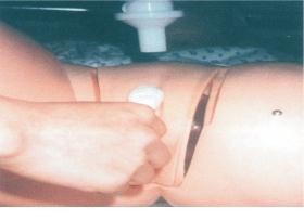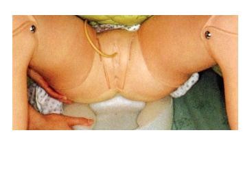 3.第一枝棉枝冲洗中央:阴蒂、经尿道口到会阴至肛门,如图十二。第二枝棉枝冲洗远测小阴唇内面(注意:每一枝棉枝必须由上往下清洁擦拭,且不要重复使用,碰触肛门口时则不可再用),使用过后的棉枝随手丢入准备好的塑胶袋内。