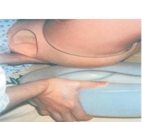 (一)对意识清楚且可配合的病人,请病人屈膝,用力抬高臀部,将便盆放入病人臀部下,如图三