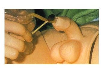 5.清洗时应用手固定阴茎并推开包皮以便清洗,确实清洗干净后需将包皮再推回,如图八,以免发生肿胀。