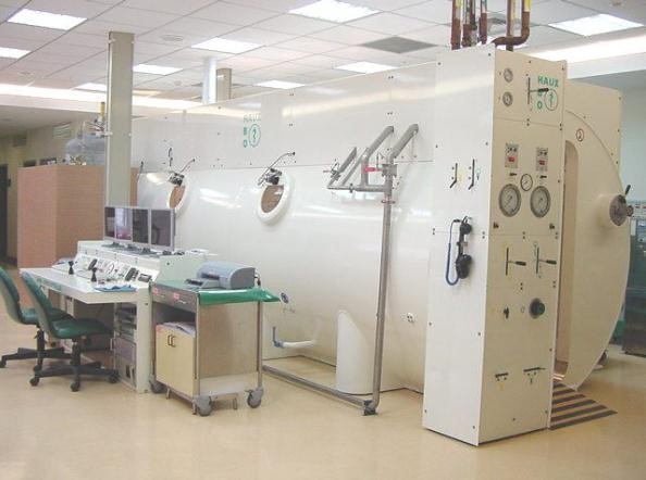 高压氧治疗是将病人安排于经加压后,并维持在设定压力之高压舱内,让病人经由氧气面罩或头罩,于短时间及间断性吸入 100 %氧气,以提高血中及患部组织含氧浓度,改善体内气泡可能造成的危害,或减少缺氧组织的伤害,并可促进伤口愈合,使血管收缩,减轻创伤后的组织间隙水肿,增强白血球之杀菌能力。