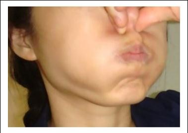 (二)高压氧治疗加压时,可能会因压力改变而感到耳膜鼓胀,但并无危险,可做耳膜平衡动作,如:张开嘴巴(图一)、吞咽口水(图二),或用手捏紧鼻子、闭住嘴巴,同时用力鼓气于口咽腔(图三),此两种动作