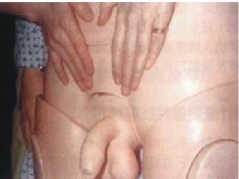 3.以两手掌自肚脐以下顺着输尿管呈V字形方向,向下移行并加压到耻骨处,如图一。