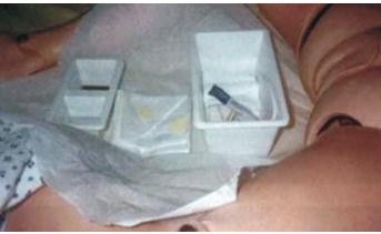 七、打开导尿包,需注意双手勿碰触导尿包内的物品,并将导尿包布的一端置放于病人臀部下,如图五。