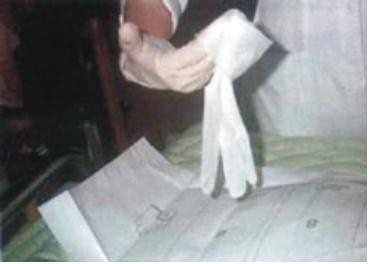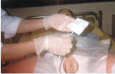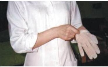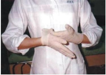 八、执行导尿者,双手请戴上无菌手套,双手维持腰部以上,以免染污,如图六、七、八。