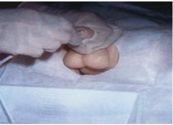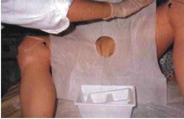 九、手执无菌洞巾的两端,覆盖于病人之阴部,使尿道口露于洞巾中之开口处(当戴上手套后不能接触洞巾以外的地方,以免污染),如图九。